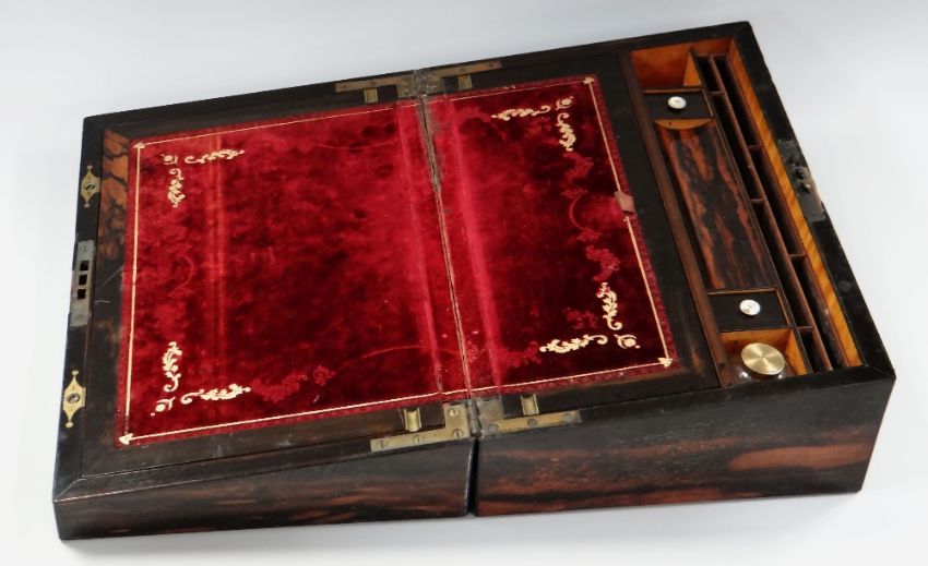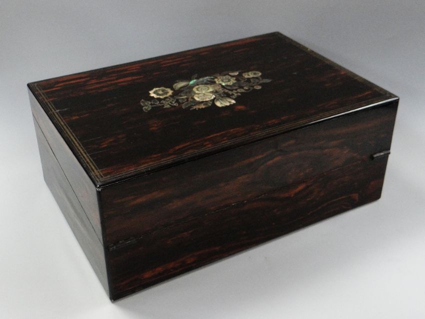 AN MOTHER-OF-PEARL INLAID AMBOYNA LAP DESK with inlaid brass mounting and fitted satinwood interior with velvet lining, 38cms wide