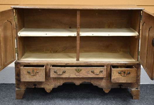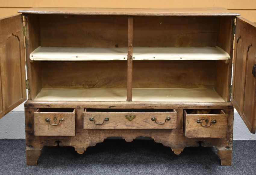 AN EARLY NINETEENTH CENTURY OAK BLANKET CHEST converted to shelved cupboard and having a three drawer base, 143cms wide, 105cms high