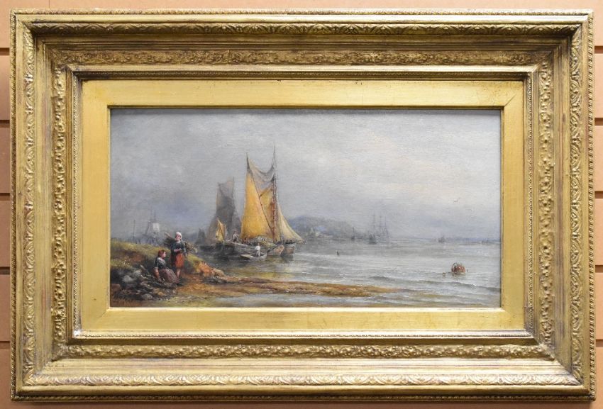 JOHN REES oil on canvas - fishing boats, figures & larger sailing ship on an estuary, entitled verso 'Near Purfleet on the Thames', signed & dated 1878, 26 x 52cmsIts in excellent condition, no problems.The size is 52 x 80cms with frame It is from a private collection, many paintings bequeathed from the vendors uncle who was a high-end antique and fine art dealer/collector