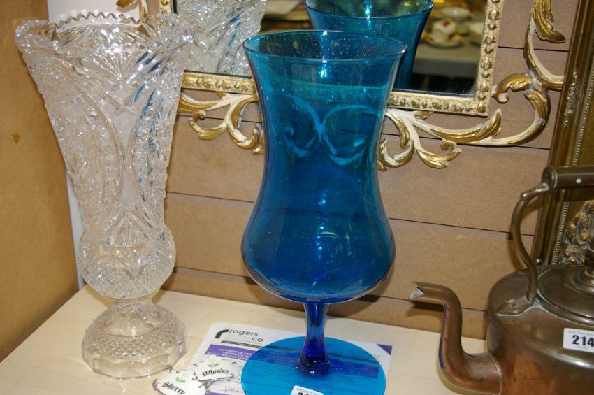 Heavy glass vase, another art glass vase and two spirit bottle labels