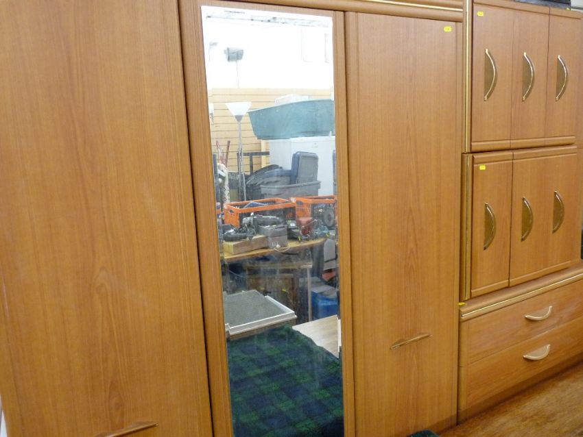 Modern light wood effect three piece bedroom suite of triple door wardrobe with central mirror, five drawer chest and a pair of three drawer bedside chests