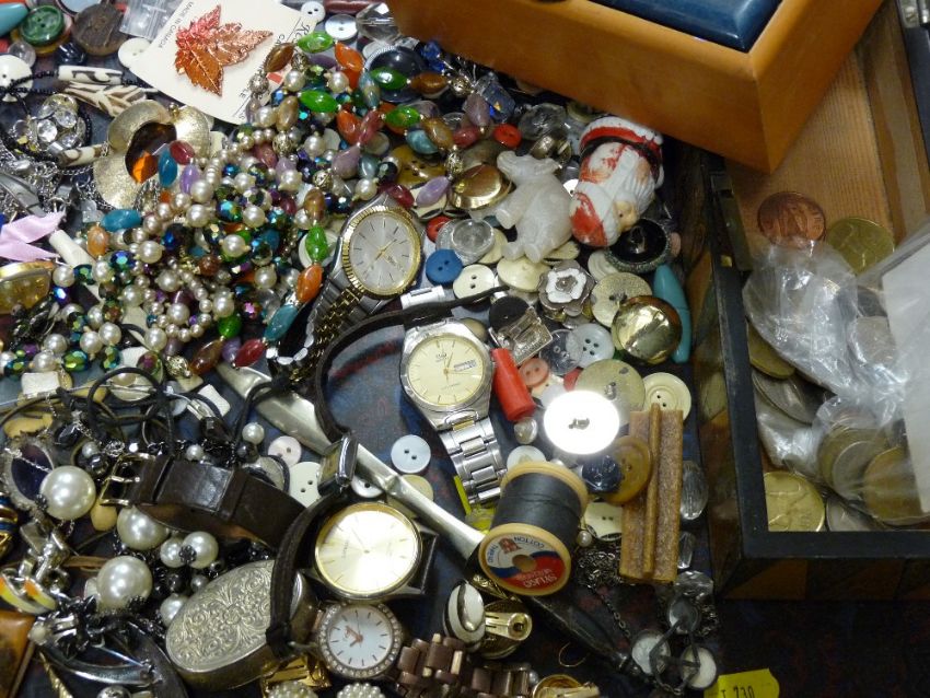 Tray of costume jewellery, lady's and gent's wristwatches, buttons etc