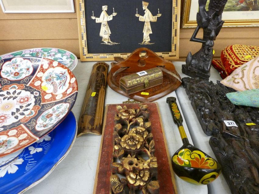 Parcel of mainly treen including gilt panel, brass decorated box, carving set etc