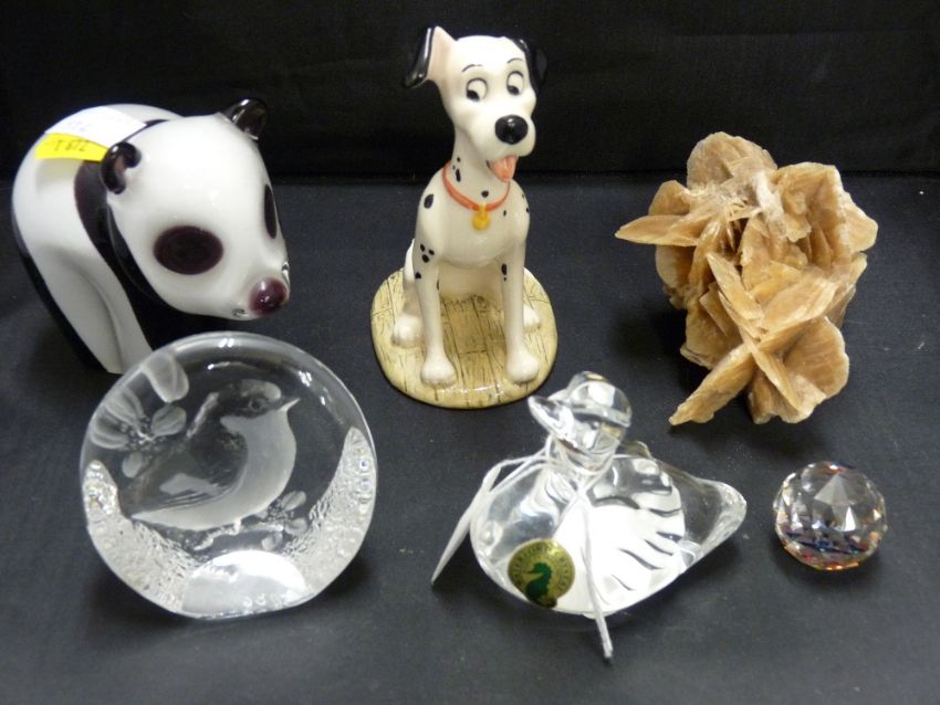 Waterford glass ornamental cygnet, a panda bear glass paperweight, Royal Doulton Disney's 101 Dalmatians 'Pongo' etc