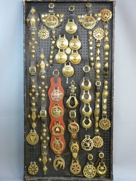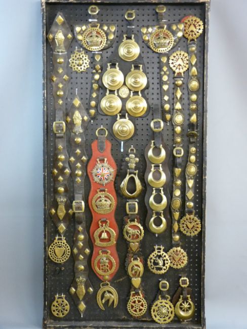 SHIRE/HEAVY HORSE BRASSWARE - a 4ft display board mounted with antique and commemorative brass and leather harnessing including a pair of 'Hughes, Llangollen Diamond Jubilee 1837-1897' examples, a pair of 'T J Williams, St Asaph' makers marked straps, a martingale of four Queen Elizabeth commemorative brasses, Jubilee year 2002, a shaped breastplate of six beehive rosettes by 'T Hill, Saddler, Norfolk Street, Sheffield' etc