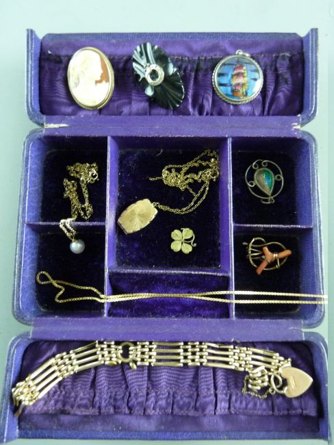 AN EDWARDIAN JEWELLERY CASE & CONTENTS including a nine carat gold locket and chain with two further nine carat gold fine necklaces, one with cultured pearl mount, 10.6 grms gross, a nine carat gold padlock with unmarked and untested four bar link bracelet, 12 grms gross, two silver pendants, a coral set brooch, a carved cameo etc