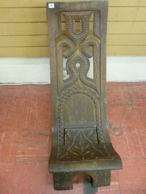 A SURINAME TRIBAL FOLDING CHAIR fashioned from a single piece of timber with pierced and carved details, 86 cms high, 37.25 cms wide