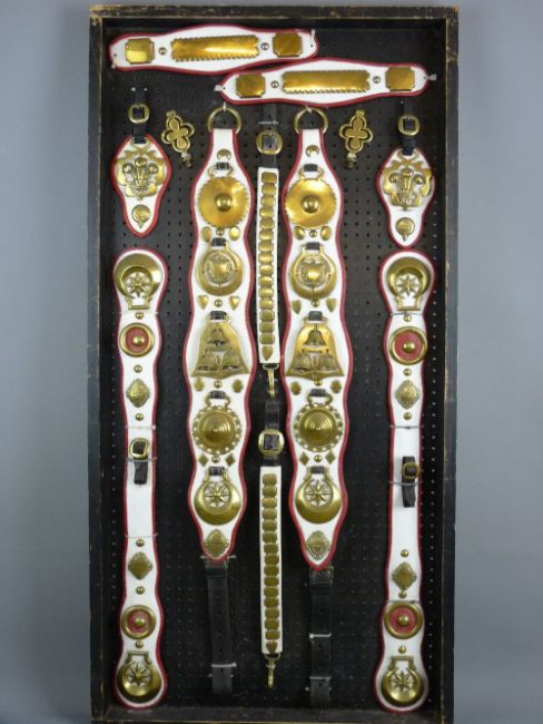 SHIRE/HEAVY HORSE BRASSWARE - a 4ft display board mounted with a twelve piece shire horse harness set by 'J Jones, Maker, Abergele', the brasswork on red and white leather strapping, vintage period, quite possibly unique
