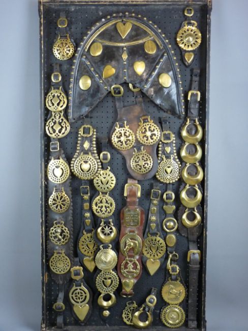 SHIRE/HEAVY HORSE BRASSWARE - a 4ft display board mounted with early Victorian and later brass decorated leatherwork and martingales, some brasses having unusual designs, two straps with maker's names 'Hennessey, Maker Usk' and 'Badenoch, Saddler'