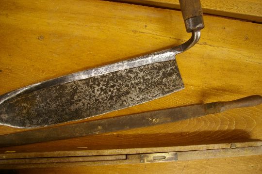 A HAND SCYTHE, A SLATE LIFTER and a vintage architect's level/square