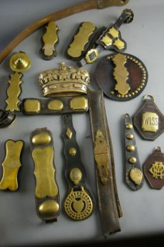 SHIRE/HEAVY HORSE BRASSWARE including hames and nameplates, decorative strap work and interesting articles including a brass strap marked 'T Dodds, Maker, Chester, 1882'