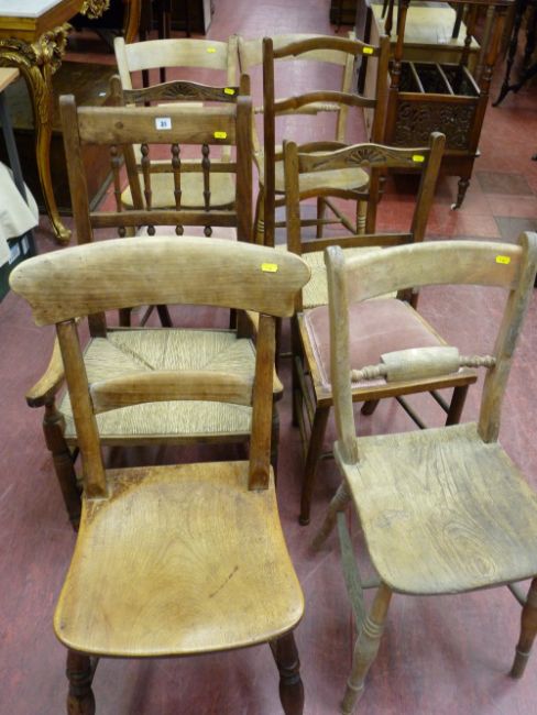 A RUSH SEATED SPINDLEBACK ARMCHAIR, four vintage farmhouse chairs and three others