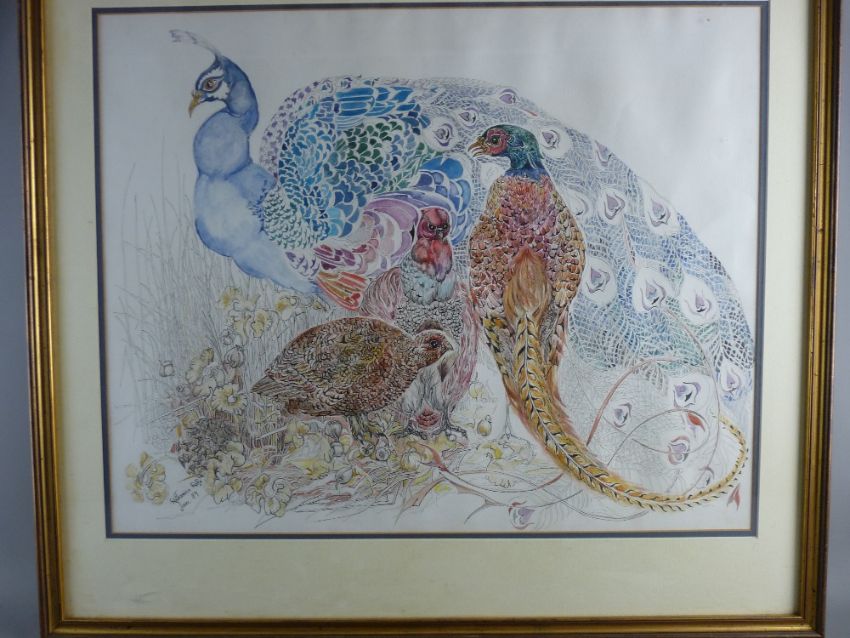 KATHERINE ROLFE pen and watercolour - study of peacock and pheasants, signed in full and dated January '89, 51.5 x 64 cms