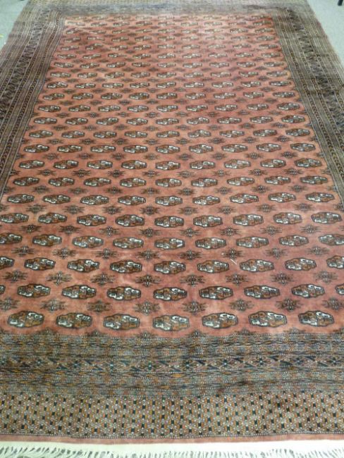 A GOOD LARGE EASTERN WOOLLEN WOVEN CARPET, red ground multi-bordered with a repeating segmented central pattern and tasselled ends, 306 x 222 cms