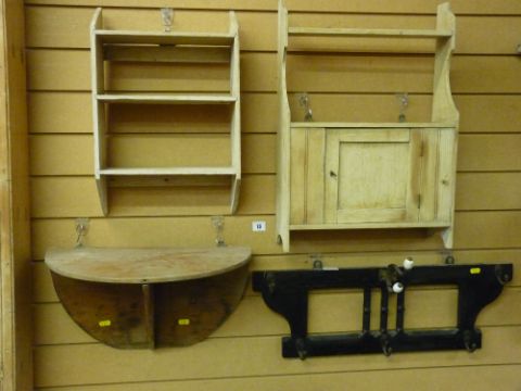 A FRENCH STYLE COAT RACK and three stripped wooden shelf units