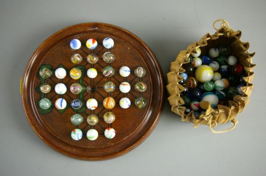 A VINTAGE WOODEN SOLITAIRE BOARD on squat bun feet with seventy eight ribbon core swirl and other decorative marbles