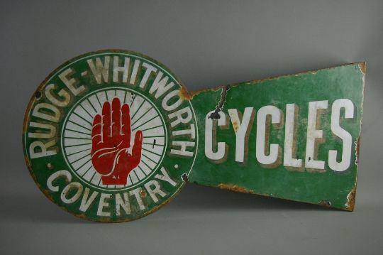 A VINTAGE DOUBLE SIDED ENAMEL SIGN for 'Rudge, Whitworth, Coventry, Cycles' (age commensurate wear)
