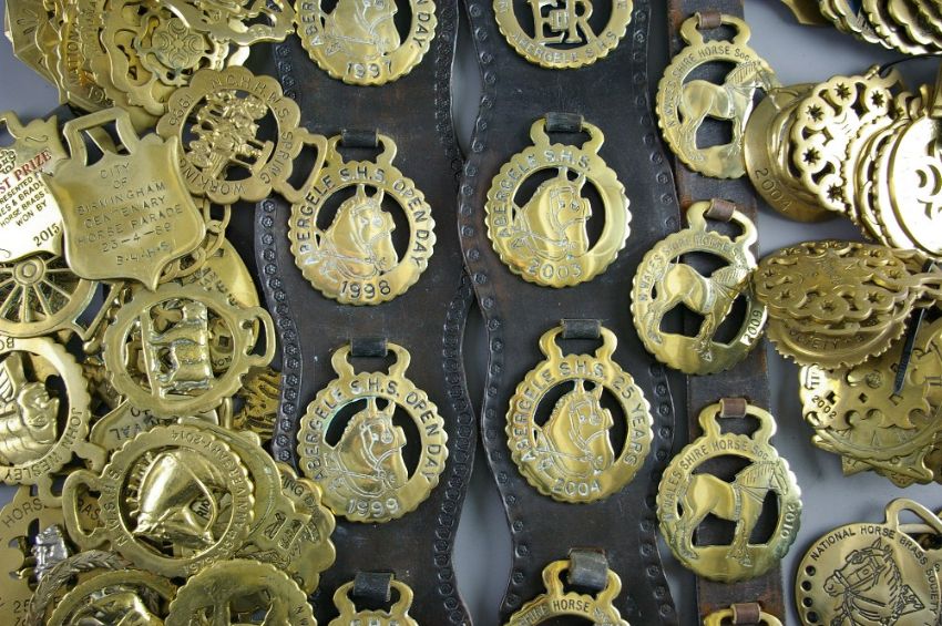SHIRE/HEAVY HORSE BRASSWARE - including three martingales of 'Abergele and North Wales Shire Horse Society' brasses, a large collection of 'National Horse Brass Society' brasses and others including a 'City of Birmingham Centenary Horse Parade' dated '89 and a quantity of others