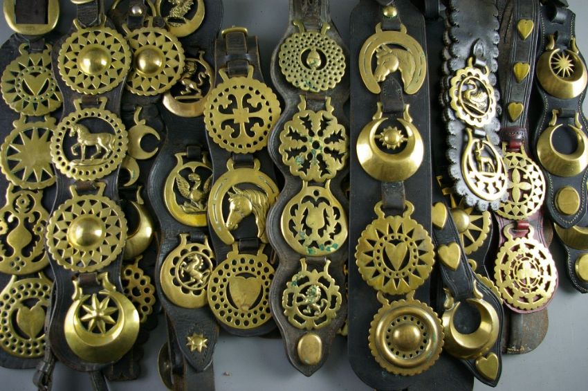 SHIRE/HEAVY HORSE BRASSWARE mounted on fourteen martingales including six double strap examples, Victorian and later in both classical and unusual designs