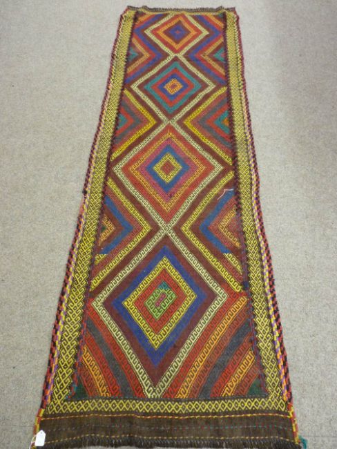 A SUZNI KILIM RUNNER, multi-coloured central diamond pattern with stitched edge border, 233 x 72 cms