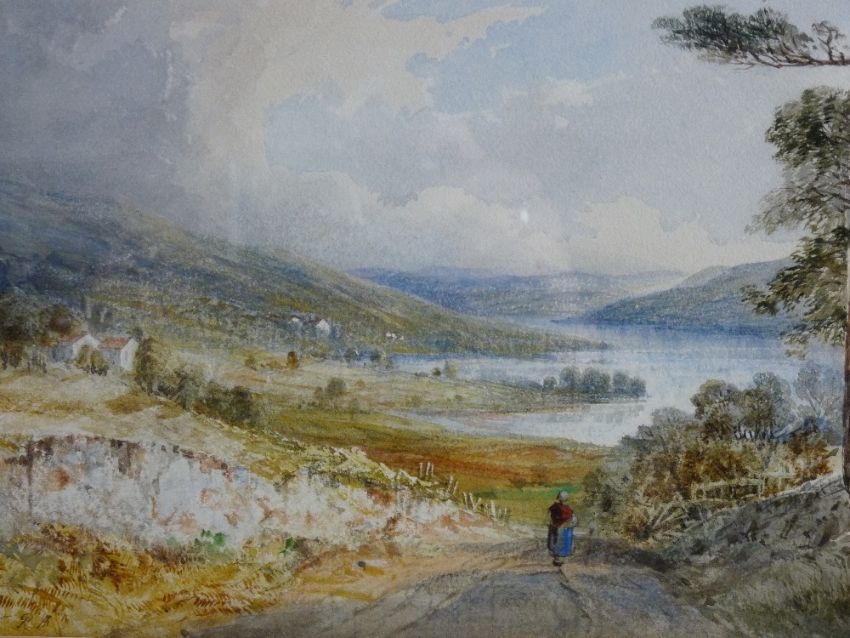 THOMAS CRESWICK RA watercolour - expansive landscape with lake and lady on a path in the foreground, signed, 22.5 x 31 cms