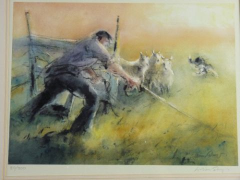 WILLIAM SELWYN limited edition (80/300) print - shepherd with his sheep and sheepdog, signed, 29.5 x 40 cms