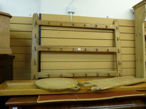 A VINTAGE PINE WITH IRON HOOKS RACK, a bread oven board and one other and a long pine panel, 86 x 114 cms the rack