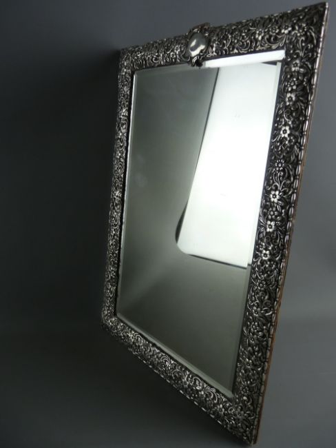 A LARGE EMBOSSED SILVER DRESSING TABLE MIRROR, rectangular with bevelled edged glass and easel stand, 44.5 x 31.5 cms