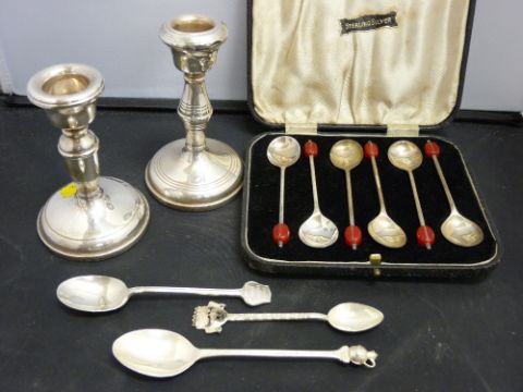 Cased set of cocoa bean spoons, three collector's teaspoons and two small loaded candlesticks, all silver