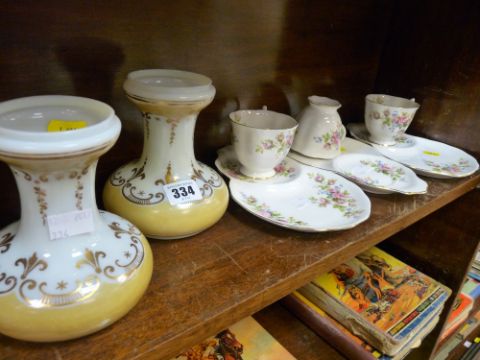 Pair of vintage milk glass vases, gilt decorated and three Royal Albert 'Moss Rose' teacup and plate sets