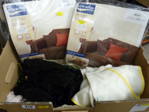 Box of vintage linen, two unopened bedcovers etc