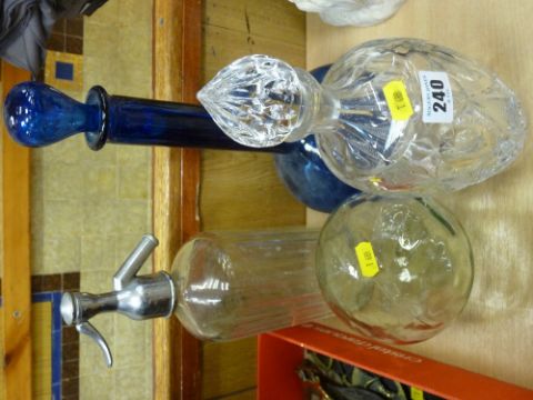 Cut glass decanter and stopper, a glass fishing net float, soda syphon etc