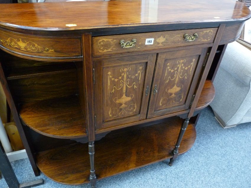 Circa 1900 inlaid rosewood side cabinet with open shelf display areas and central frieze drawer over twin cupboard doors, the panels inlaid with ribbon swag and urn detail