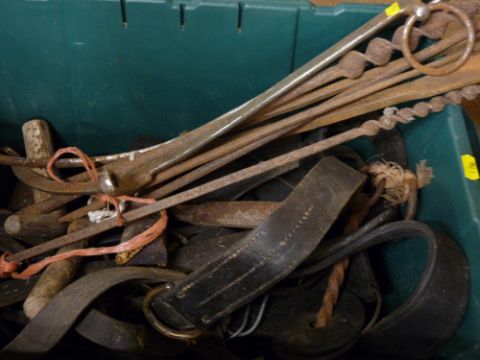 Crate of tools, metal hames and brass dressed harnessing etc