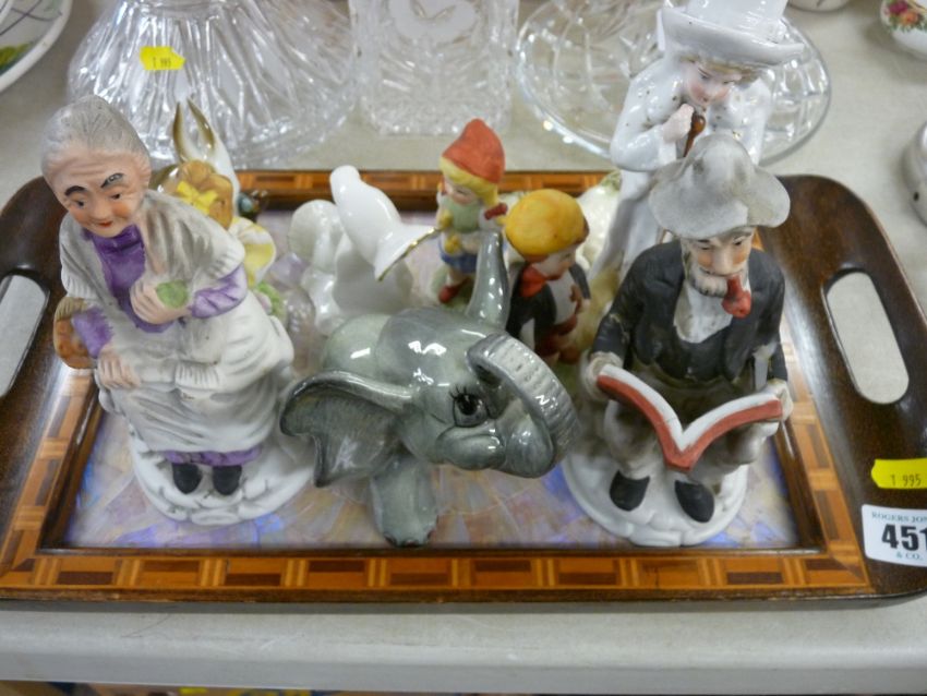 Butterfly wing two handled tray and a selection of ornamental figurines
