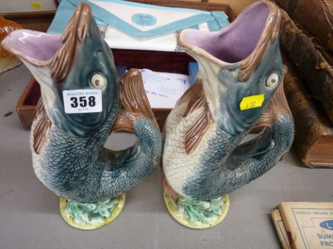 Two Majolica fish glug jugs