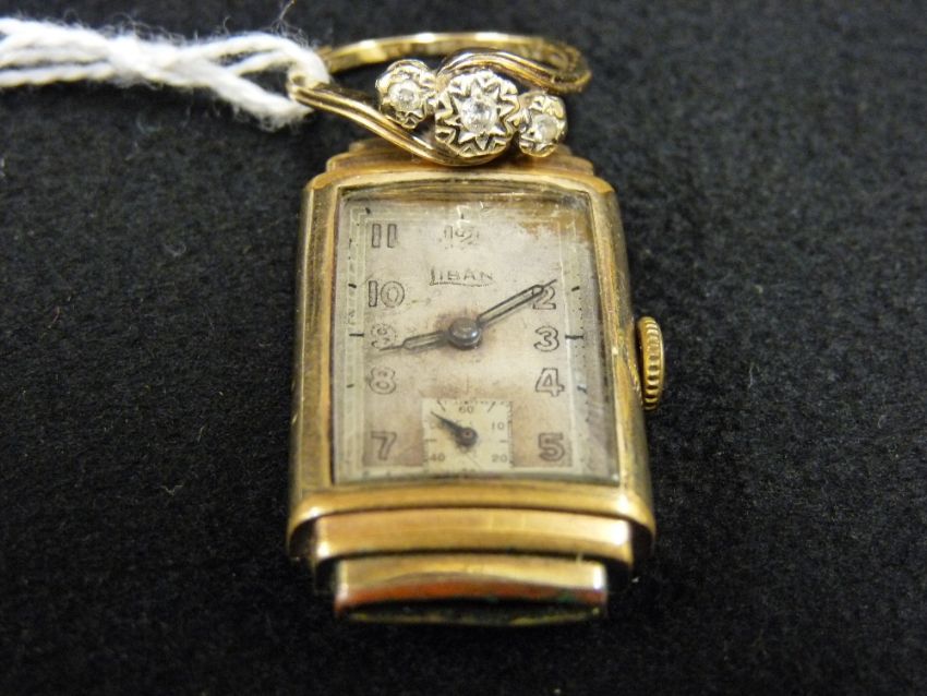 Nine carat gold three stone diamond crossover dress ring and an oblong dial Liban wristwatch, yellow metal cased with no strap