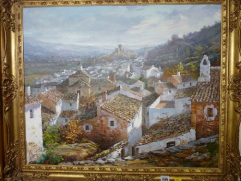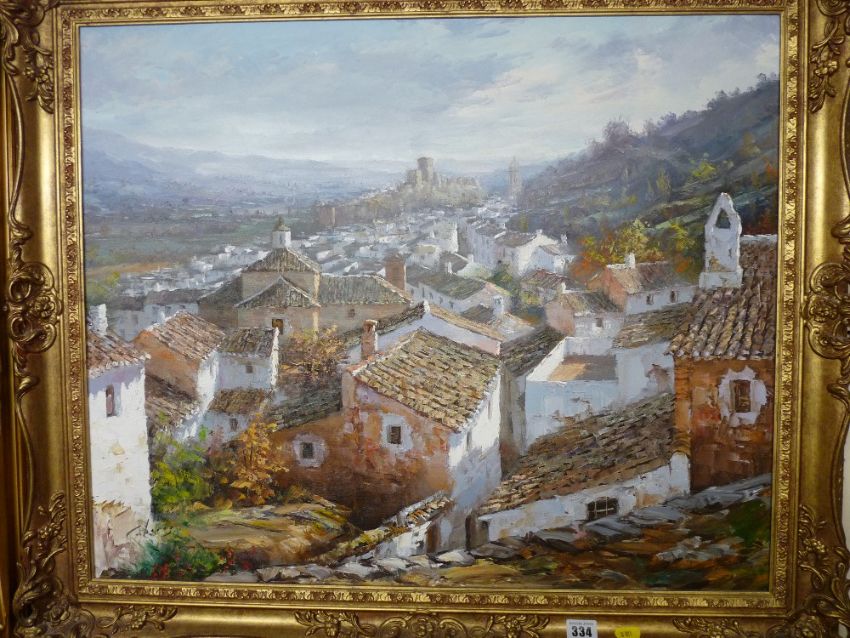 Good modern gilt framed oil on canvas - Mediterranean town with castle to the background, indistinctly signed
