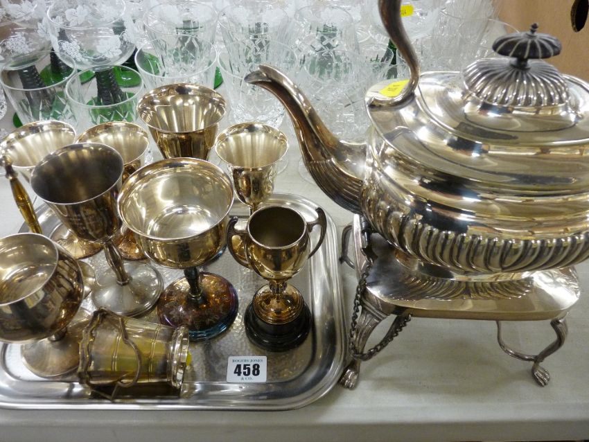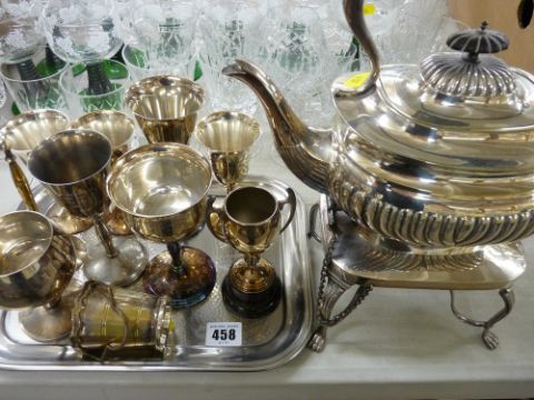 EP spirit kettle on stand, two EP goblets with White Star Line emblem etc
