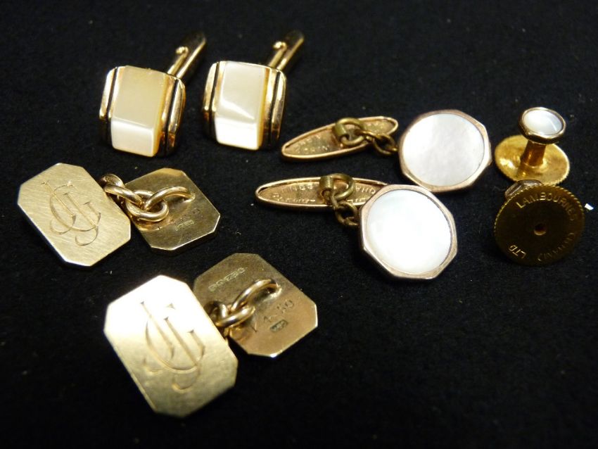 Pair of oblong nine carat gold cufflinks with canted corners, initialled 'J G J', 12.5 grms, another pair of yellow metal cufflinks and a quantity of studs etc