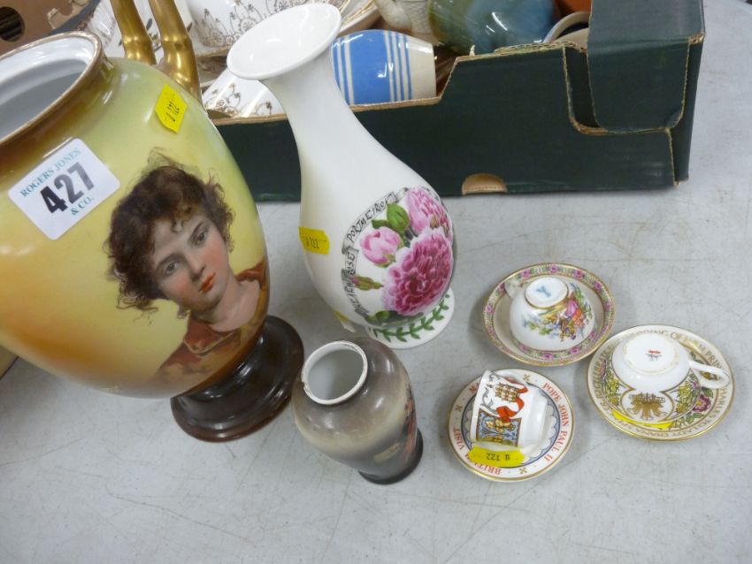 Bavarian twin handled vase and one other, three small cabinet cups, one with blue cross swords mark etc