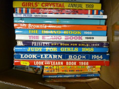 Box of children's annuals and other books including Enid Blyton's 'Noddy', 'Beano' etc