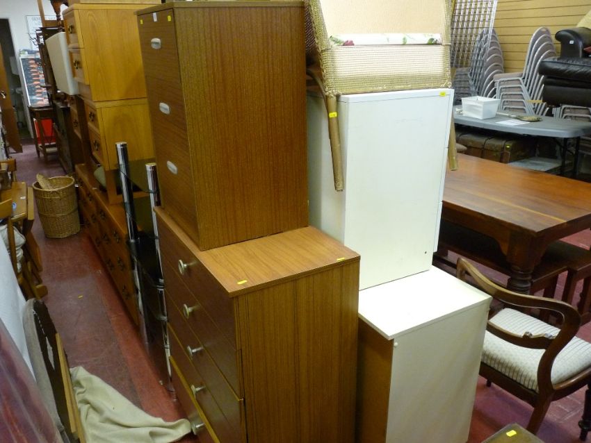 Quantity of bedroom furniture and chrome and glass TV stands, loom chair and a towel rack