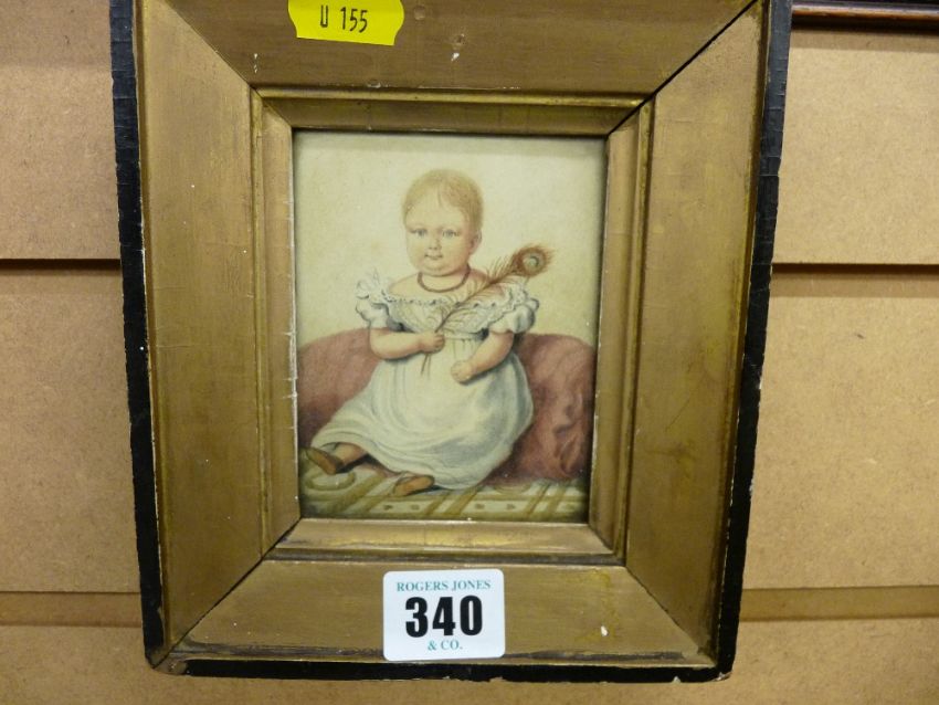 Early 19th Century portrait watercolour - young child, script verso reads 'The likeness of Benjamin, the son of Benjamin & Elizabeth Grey, taken the 7th April, 1832, aged 9 months, 17 days'