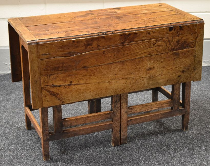 A nineteenth century joined oak gate leg table, the base with twin 'gates' at either side extending to 121cms long, 104cms wide