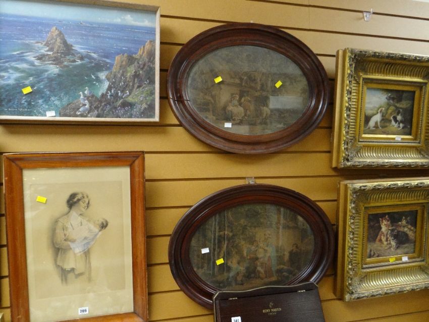 A collection of framed prints together with two reproduction gilt framed prints of cats & dogs