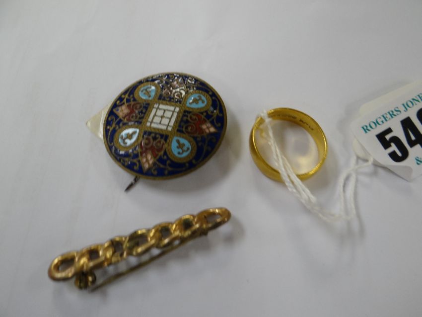 22ct gold wedding band, yellow metal rope brooch together with an enamel brooch, 7.5gms