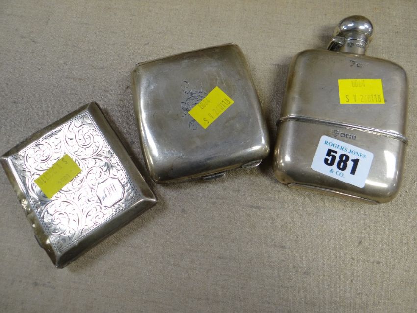 Two hallmarked silver cigarette cases & a hallmarked silver hip flask