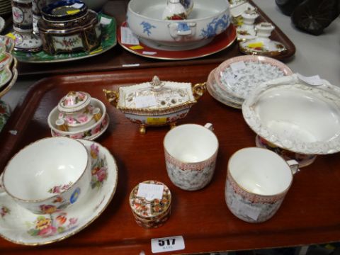 A believed Coalport ink stand painted with wild roses & with three pen holders on three bun feet picked out in gold (damage) together with three items of English antique porcelain comprising a twin-handled gondola shaped footed sucrier & cover, body painted all round with wild flowers, rim handles & knop picked out in gold & with gilded claw feet, 13.5cms long (restoration) & a floral painted circular based flower basket with raised floral rim & a marked Coalport floral cup & saucer