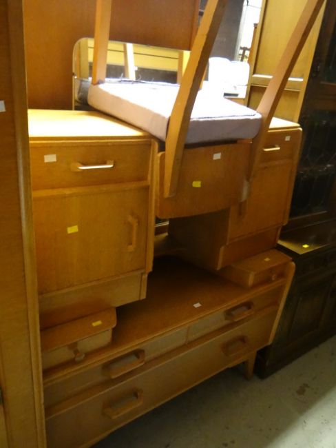 A good vintage lightwood E G by G-Plan bedroom suite comprising two-drawer wardrobe, mirrored dressing table & stool, two bedside cabinets